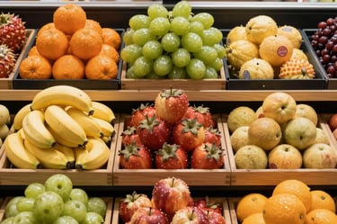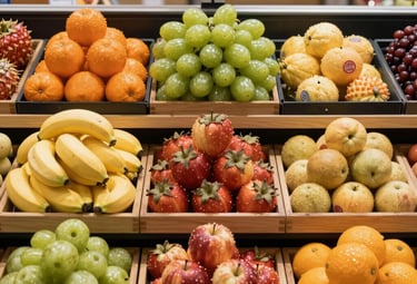 Fresh Fruits: Oranges, mangoes, bananas, watermelons, Apples, and seasonal produce.